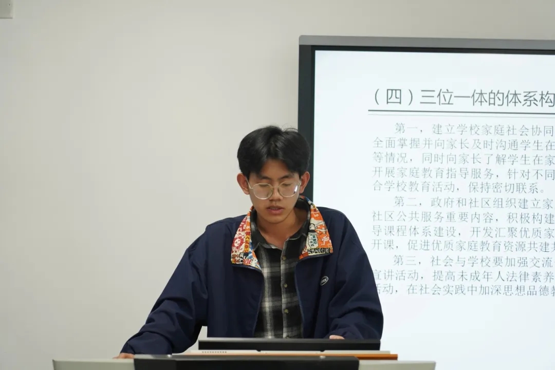 23级王侨同学通过讲解罪责刑相适应原则和监护人需要承担刑事责任的几种情况分析本案未成年人监护人是否需要承担刑事责任这一问题,并着重对不作为犯罪进行了详细介绍。接着讲述了父母和学校应当承担的民事责任并展示相关法条。最后王同学对于构建“家庭-学校-社会”三位一体保护和预防未成年人犯罪的机制提出了自己的建议,为大家提供了未成年人“无缝”监护管理的思路参考。