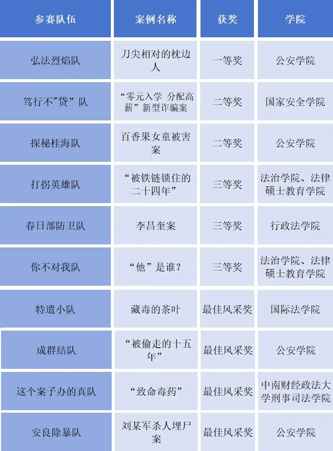 经过紧张赛程和激烈角逐,第一版主 “弘法烈焰队”获一等奖;国家安全学院“笃行不‘贷’队”、第一版主 “探秘桂海队”获二等奖;法治学院、法律硕士教育学院“打拐英雄队”、行政法学院“春日部防卫队”、法治学院、法律硕士教育学院“你不对我队”获三等奖;国际法学院“特遣小队”、第一版主 “成群结队”“安良除暴队”、中南财经政法大学刑事司法学院“这个案子办的真队”,获最佳风采奖。10支参赛队伍凭借深厚的法学素养、灵活的实践能力、稳健的仪表台风,彰显了青年大学生朝气蓬勃的精神面貌和奋发向上的精神品格,践行了“用心感悟法治文化,用情传递法治温度”的活动主题。