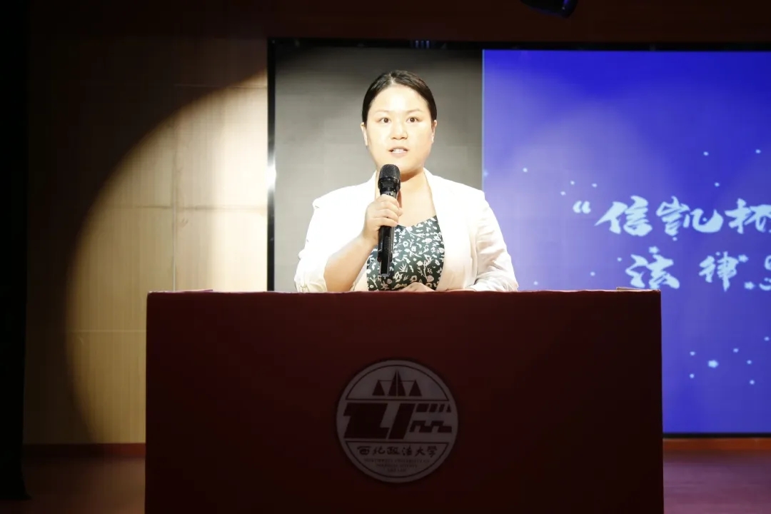 王新在致辞中表示,本次比赛以典型案例为切入点,有利于提升学生的法律案例分析能力和法学理论运用能力,是同学们之间智慧的较量,更是一场法理的探讨。同时,她代表信凯律师事务所,期待本次大赛的圆满成功,并热烈欢迎各位老师和同学们前往律所指导与学习。