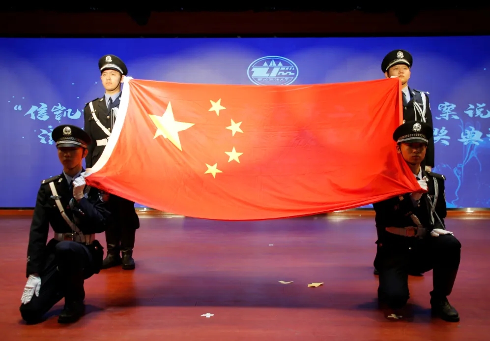 伴随着雄壮激昂的国歌,国护队员展开国旗;全场师生肃立注目,共同奏唱国歌,“探案说法”法律案例研习大赛决赛正式拉开帷幕。