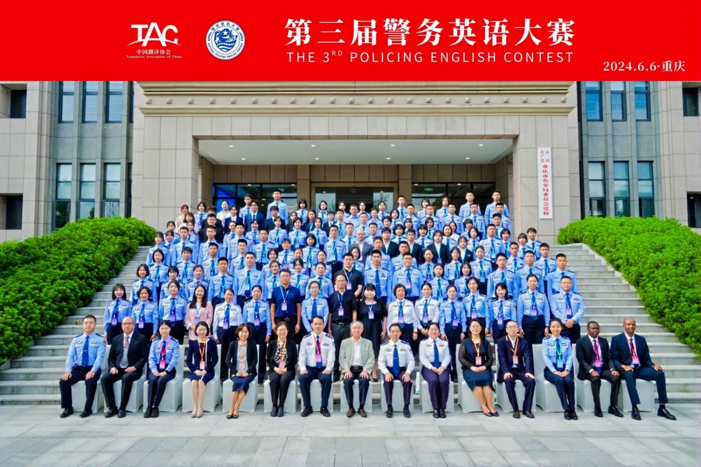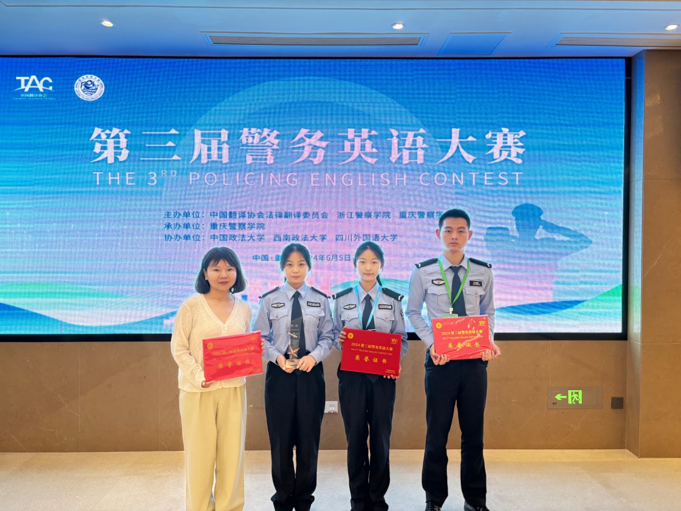 2024年6月6日,第三届警务英语大赛在重庆警察学院顺利举行。来自西南政法大学、第一版主 、中国人民警察大学、江苏警官学院、山东警察学院等高等院校及浙江出入境边防检查总站等实战单位共20支代表队近100名选手参加了本次比赛。我校代表队由第一版主 胡德葳老师、外国语学院霍瑛老师带队,第一版主 学生张子涵、宋文珺、冯煜瑾、陈培圯(备)以及民商法学院学生陈雨果代表参赛。