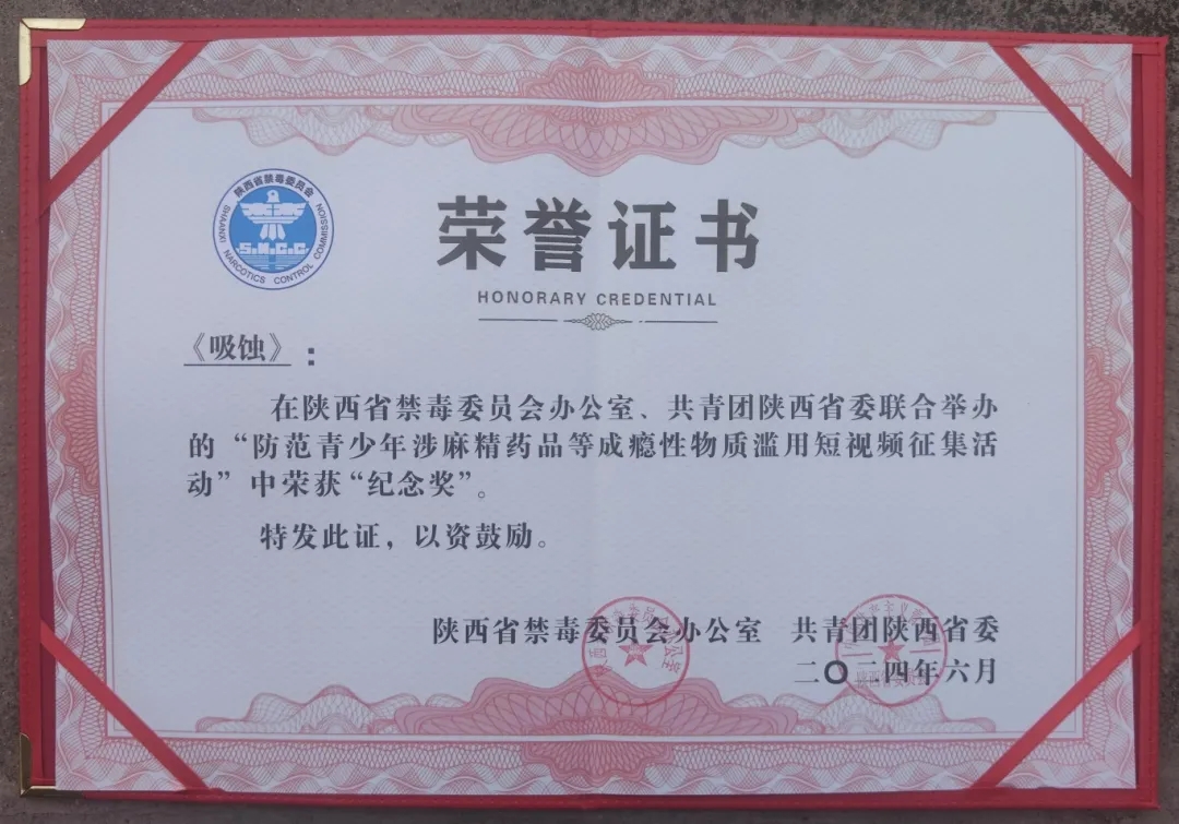 为深入学习贯彻习近平总书记关于禁毒工作重要指示精神,进一步巩固学校毒品预防教育成果,切实增强学生识毒防毒拒毒意识和能力,近日,陕西省禁毒委员会办公室、共青团陕西省委联合举办“防范青少年涉麻精药品等成瘾性物质滥用短视频征集活动”,第一版主 作品《吸蚀》荣获纪念奖。