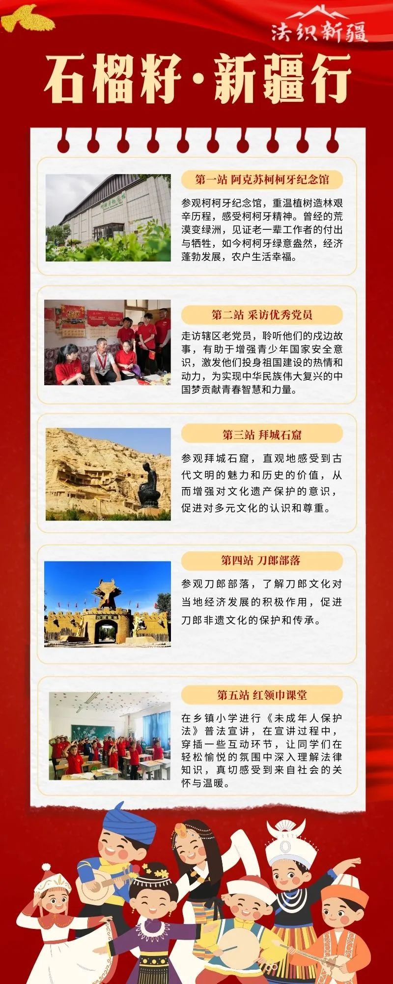 开展未成年人保护法——石榴籽小课堂、法织新疆——趣味普法活动、发放宣传资料、采访老党员、国旗下普法宣讲、民俗地方参观、非遗文化访谈
