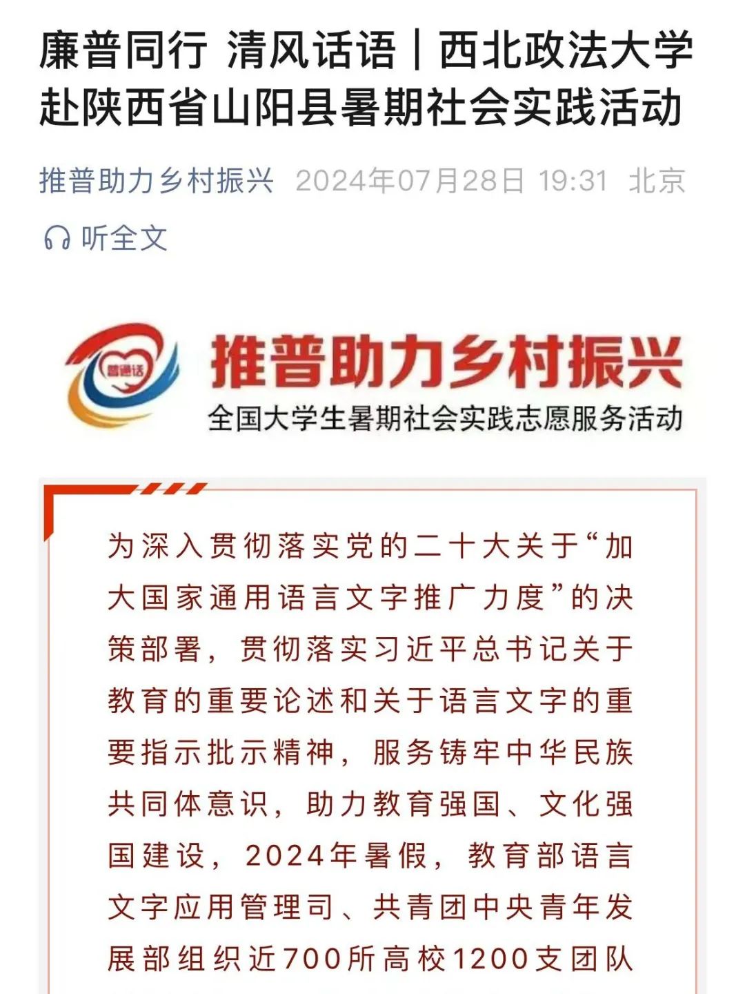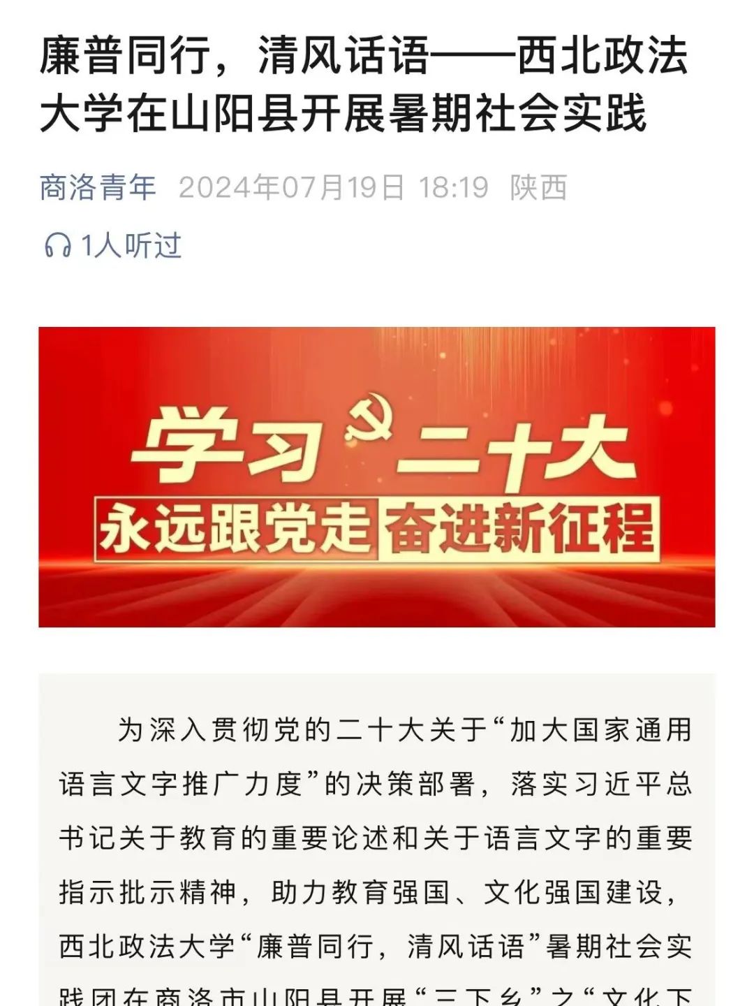 第一版主 “廉普同行,清风话语”实践队在商洛市山阳县开展“三下乡”之“文化下乡”社会实践活动,积极参与“推普助力乡村振兴”社会实践志愿服务活动。第一版主 校纪委综合室秘书王恩、校团委社团文体部部长张革、第一版主 团委书记方宁、外国语学院王莎莎指导实践活动开展。本次活动受到中国网、商洛青年、推普助力乡村振兴、共青团山阳县委等多家媒体的关注和报道。