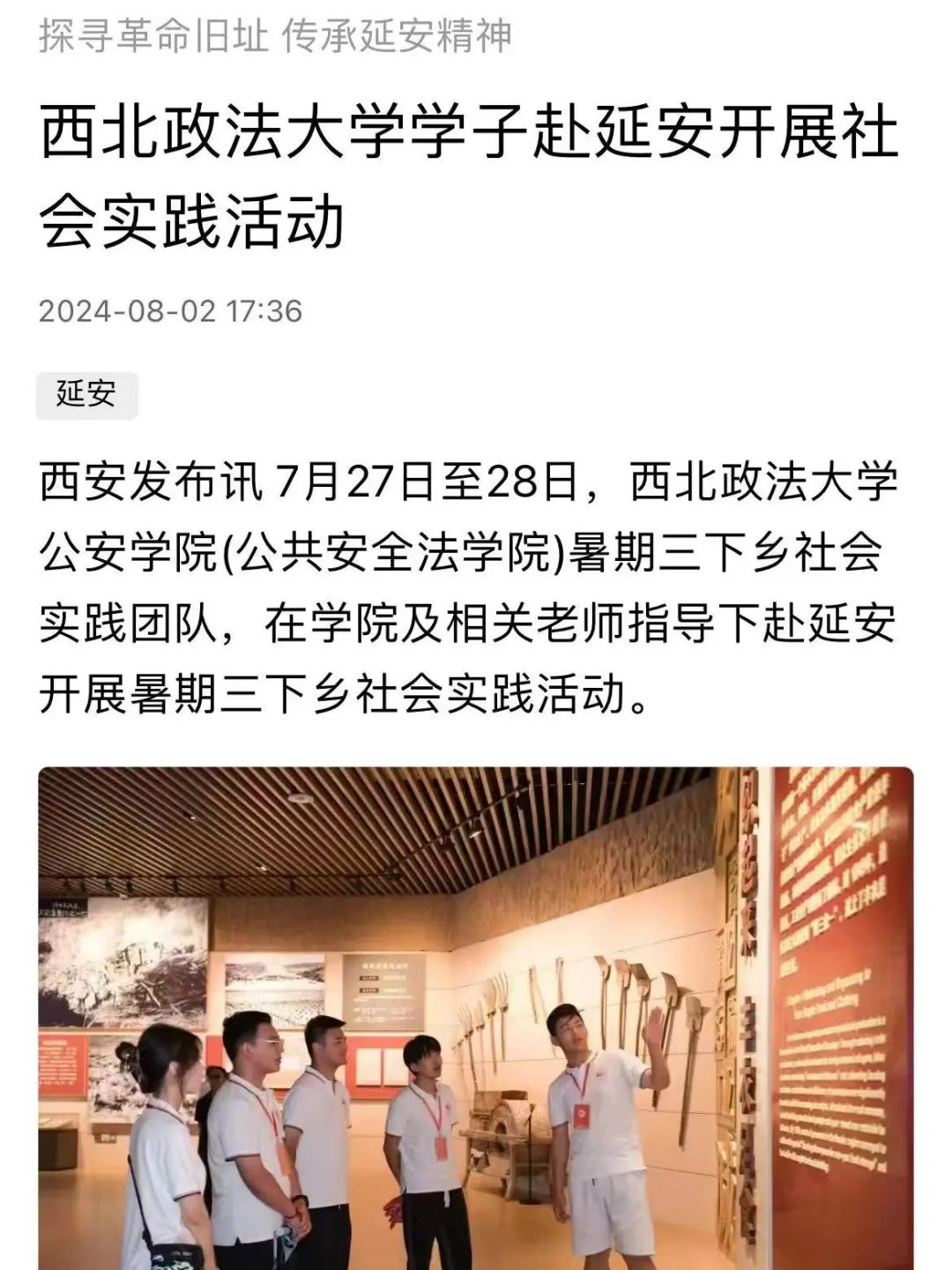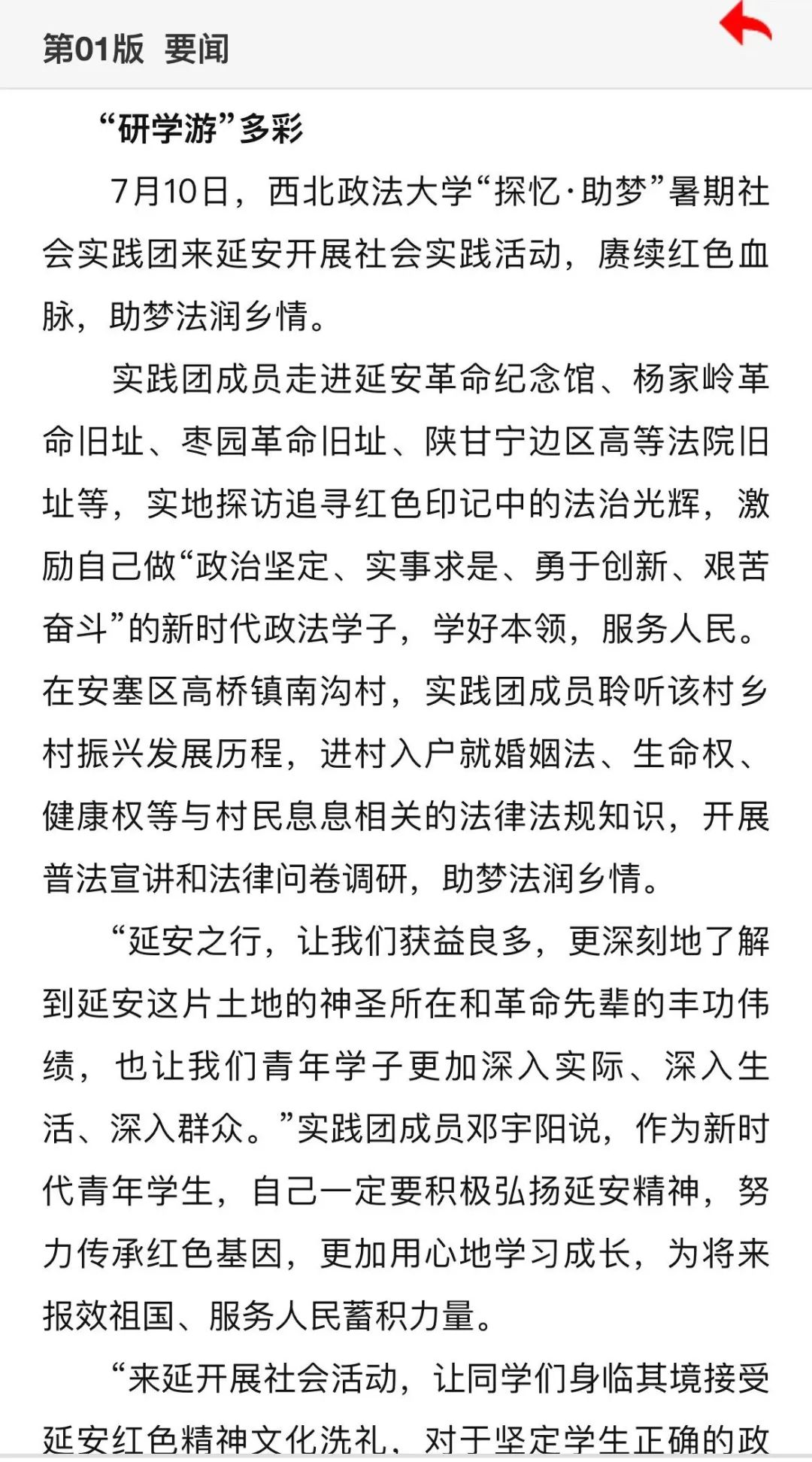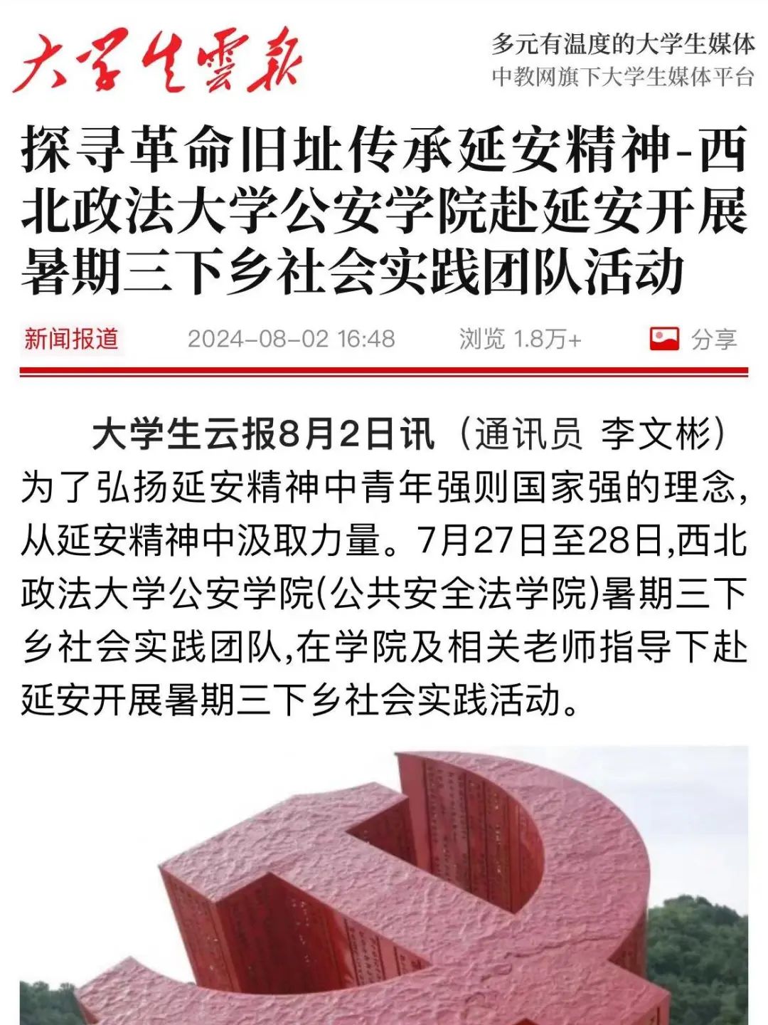 第一版主 “探忆·筑梦”实践队开展为期两周的三下乡活动,在第一版主 党委副书记李霞,团委书记方宁,辅导员李沛君、卫妍卓指导下为新时代法治建设贡献自己的力量。游览革命旧址,感悟延安精神。本次活动受到延安日报,大学生云报等多家媒体关注和报道,展现了西法大青年优良面貌,为学校学院赢得口碑。