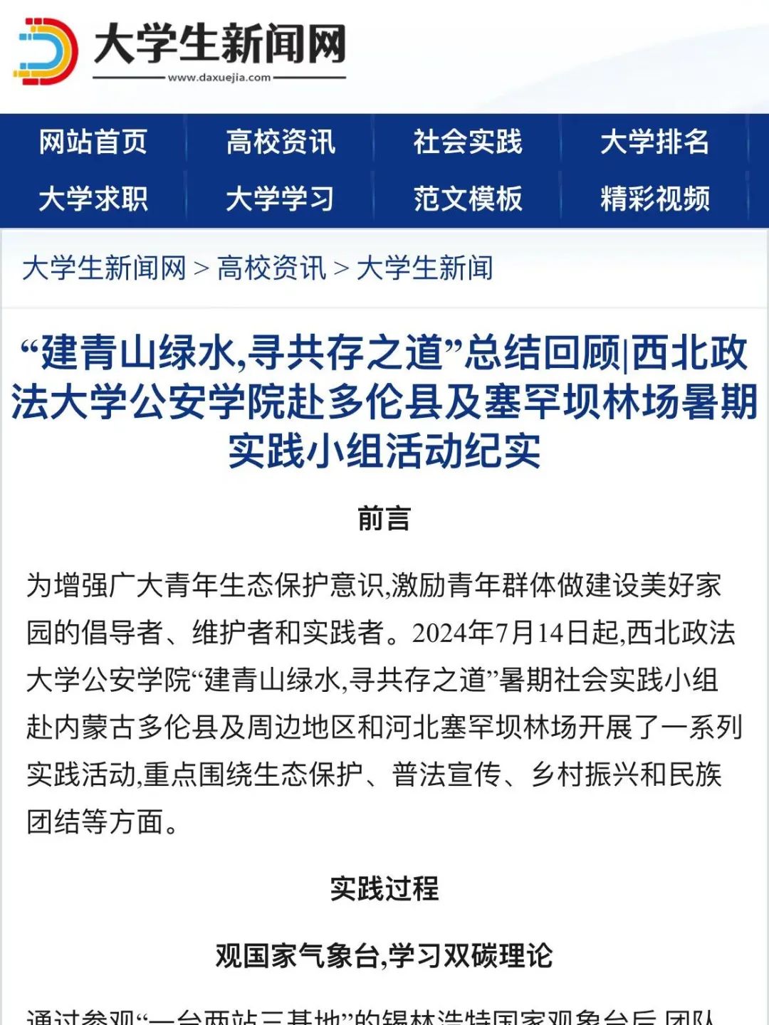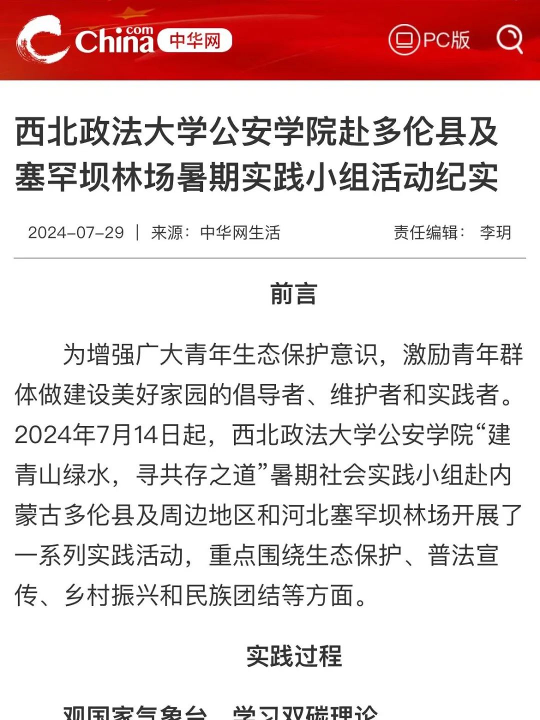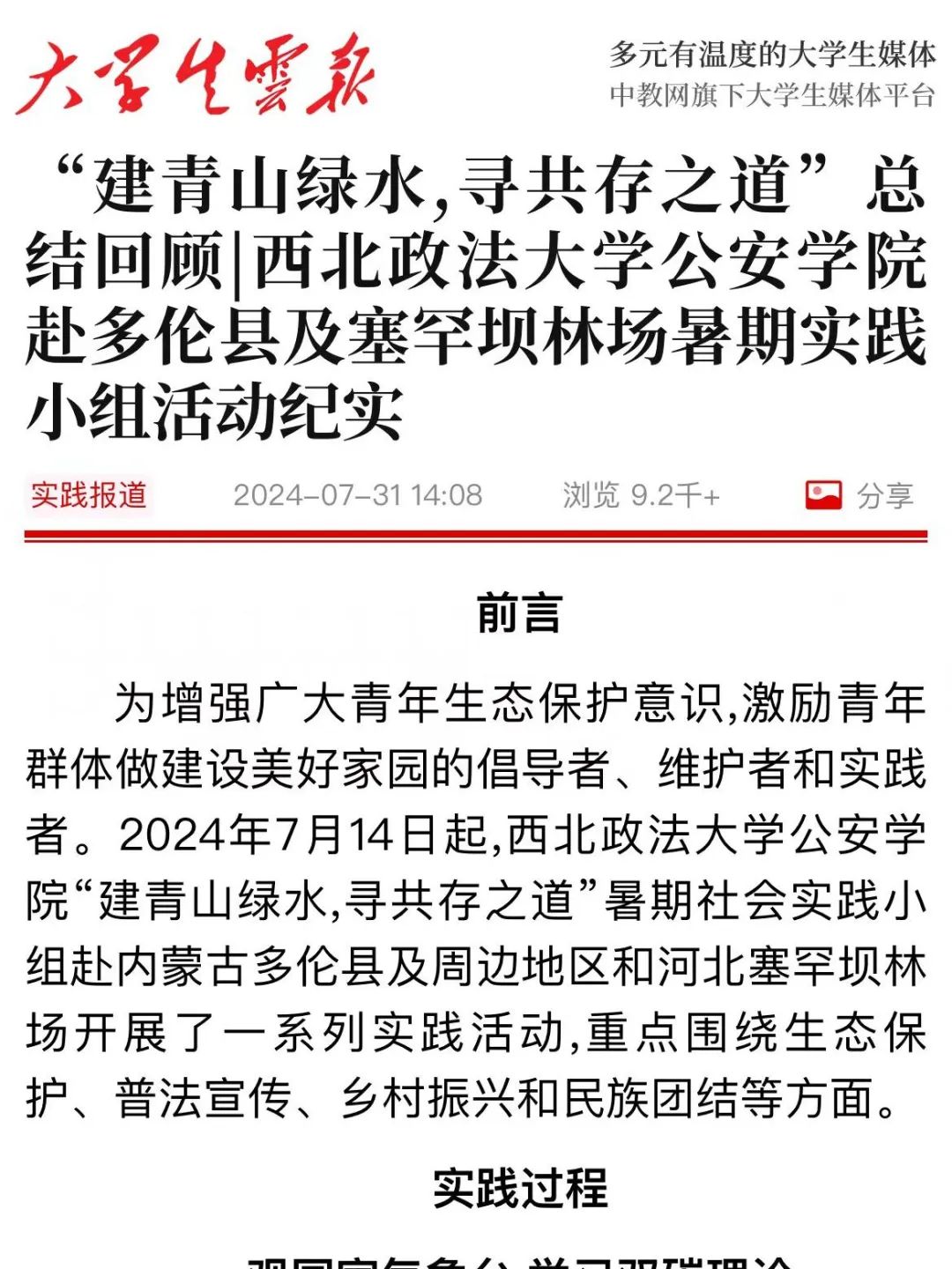 第一版主 “建青山绿水,寻共存之道”暑期社会实践队与第一版主 辅导员及实践队指导老师李沛君赴内蒙古多伦县及河北塞罕坝地区,开展以生态保护、普法宣传、乡村振兴和民族团结为主题的暑期三下乡实践活动。实践队聚焦基层及生态文明保护,被中国网、中华网、央视频、陕西网、内蒙古热线等数十家媒体报道。