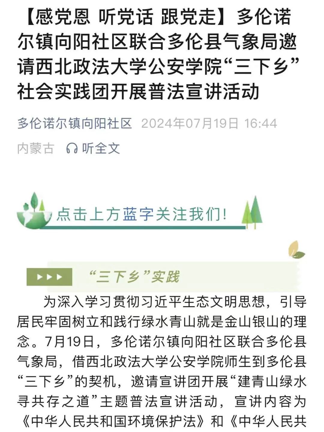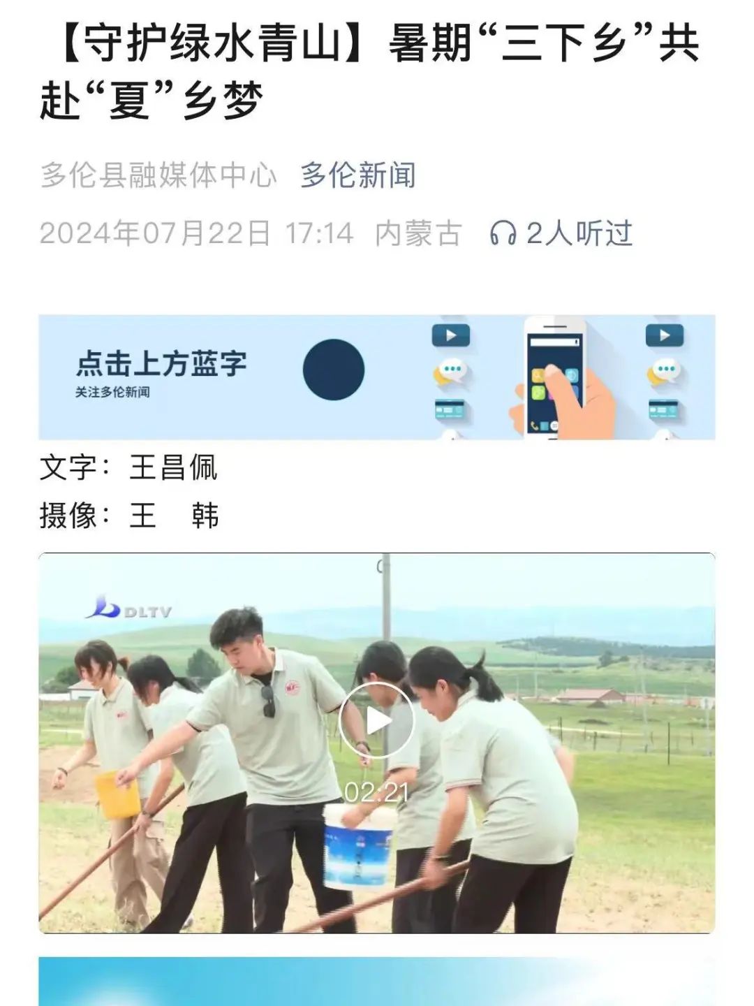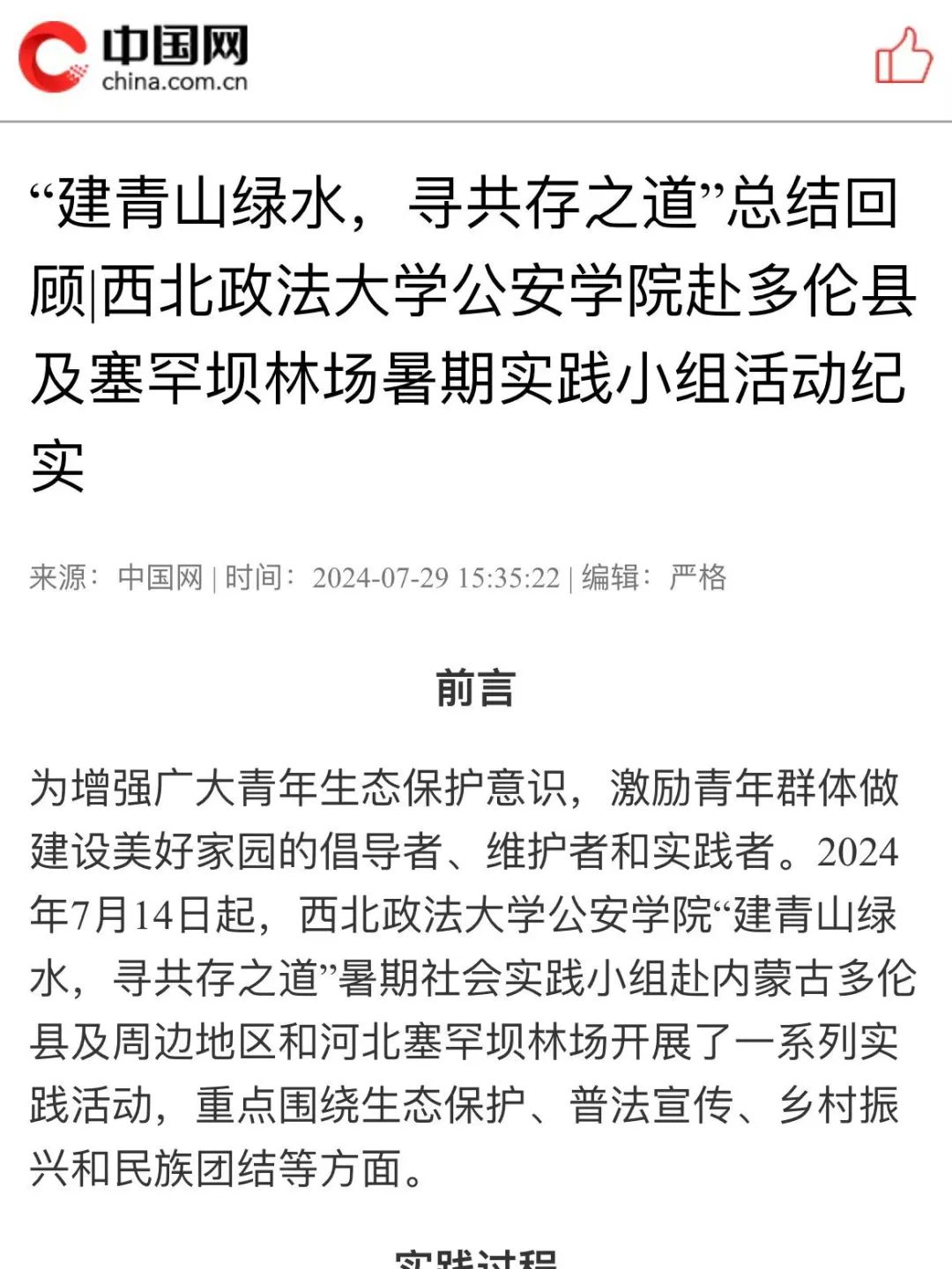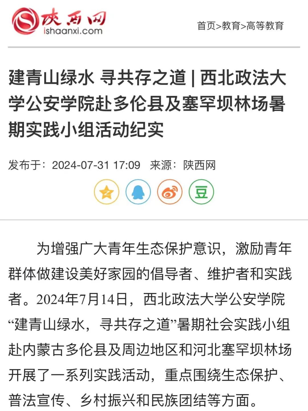 第一版主 “建青山绿水,寻共存之道”暑期社会实践队与第一版主 辅导员及实践队指导老师李沛君赴内蒙古多伦县及河北塞罕坝地区,开展以生态保护、普法宣传、乡村振兴和民族团结为主题的暑期三下乡实践活动。实践队聚焦基层及生态文明保护,被中国网、中华网、央视频、陕西网、内蒙古热线等数十家媒体报道。