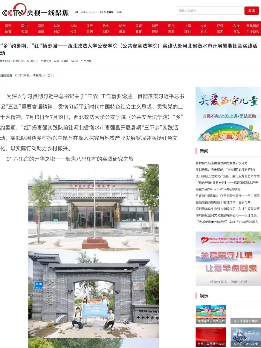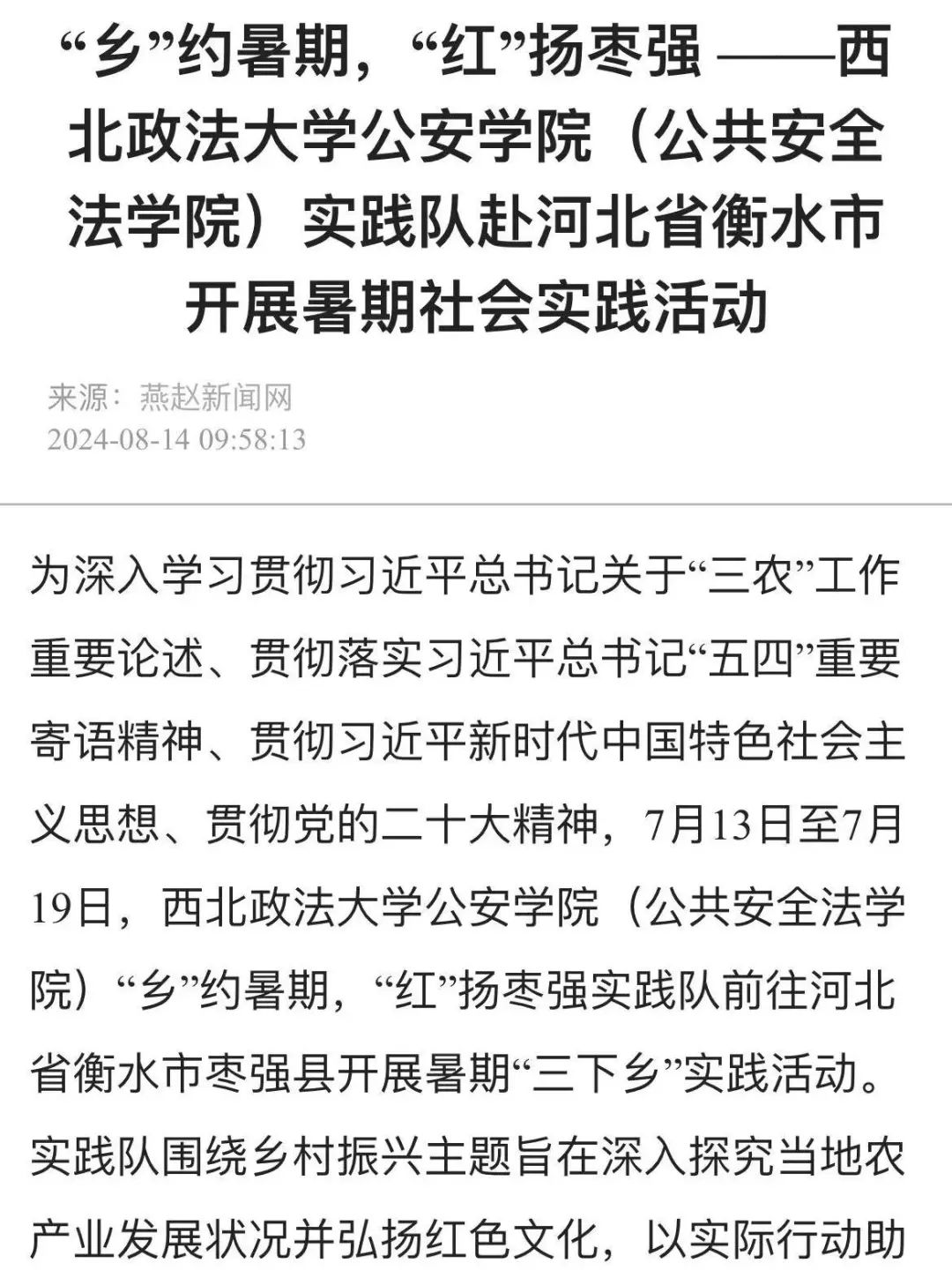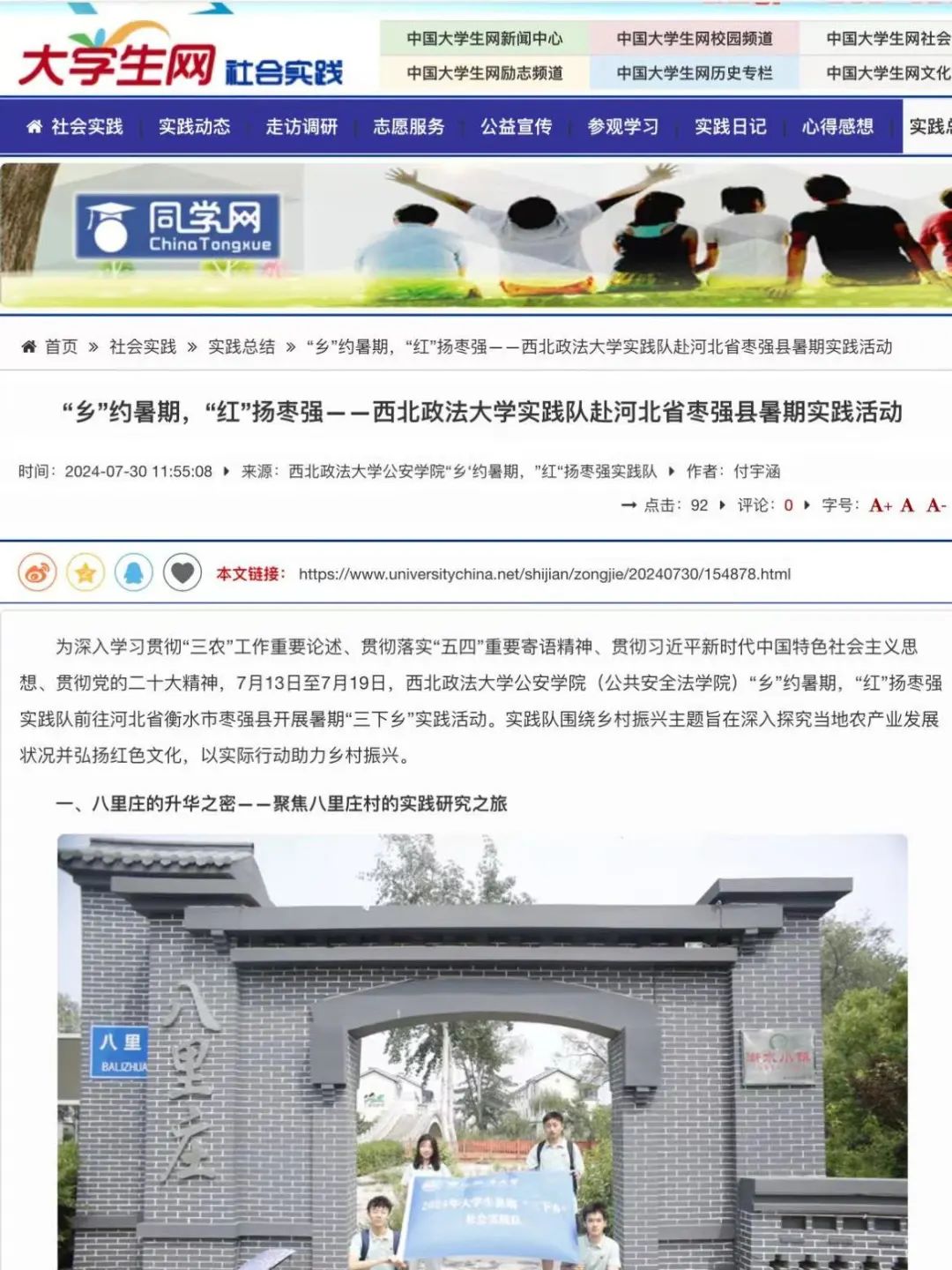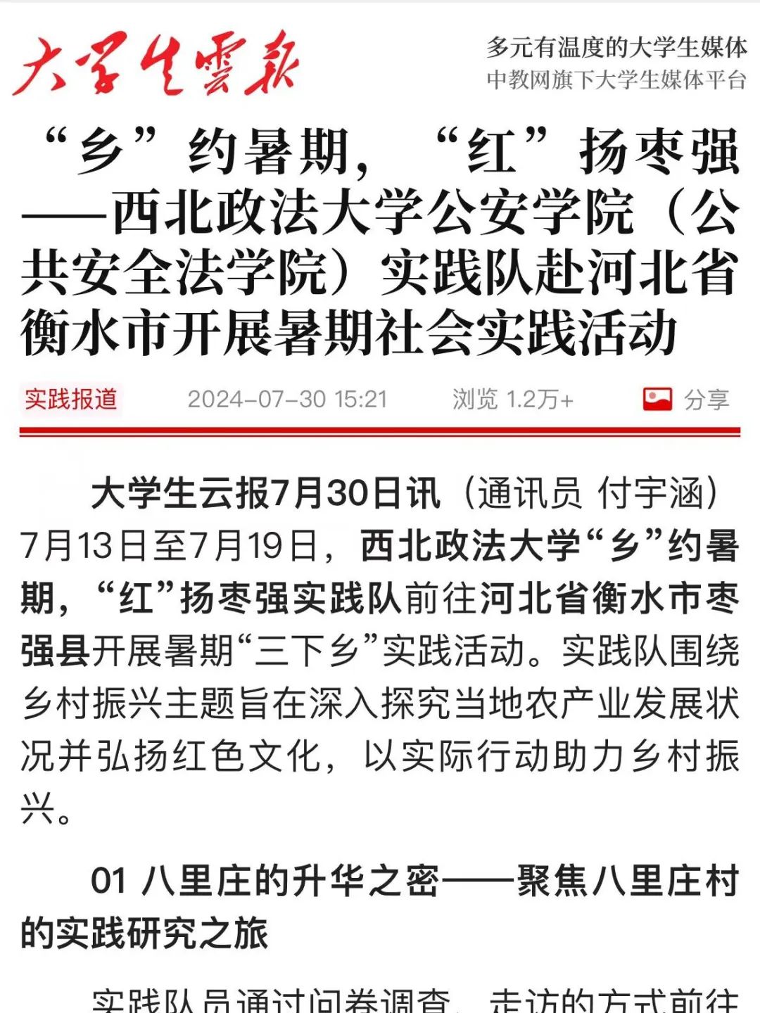 第一版主 “乡”约暑期,“红”扬枣强实践队前往河北省衡水市枣强县开展暑期“三下乡”实践活动。实践队围绕乡村振兴主题旨在深入探究当地农产业发展状况并弘扬红色文化,以实际行动助力乡村振兴。团队取得丰富的实践成果并被中国网、大学生云报、CCTV聚焦等多家媒体报道。团队成员在本次社会实践中充分发实事求是、吃苦耐劳的品质,展现出西法大学生优秀的青年风貌,得到社会多方面认可,为学校、学院赢得良好口碑和关注。