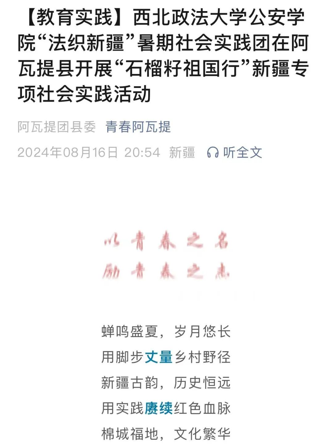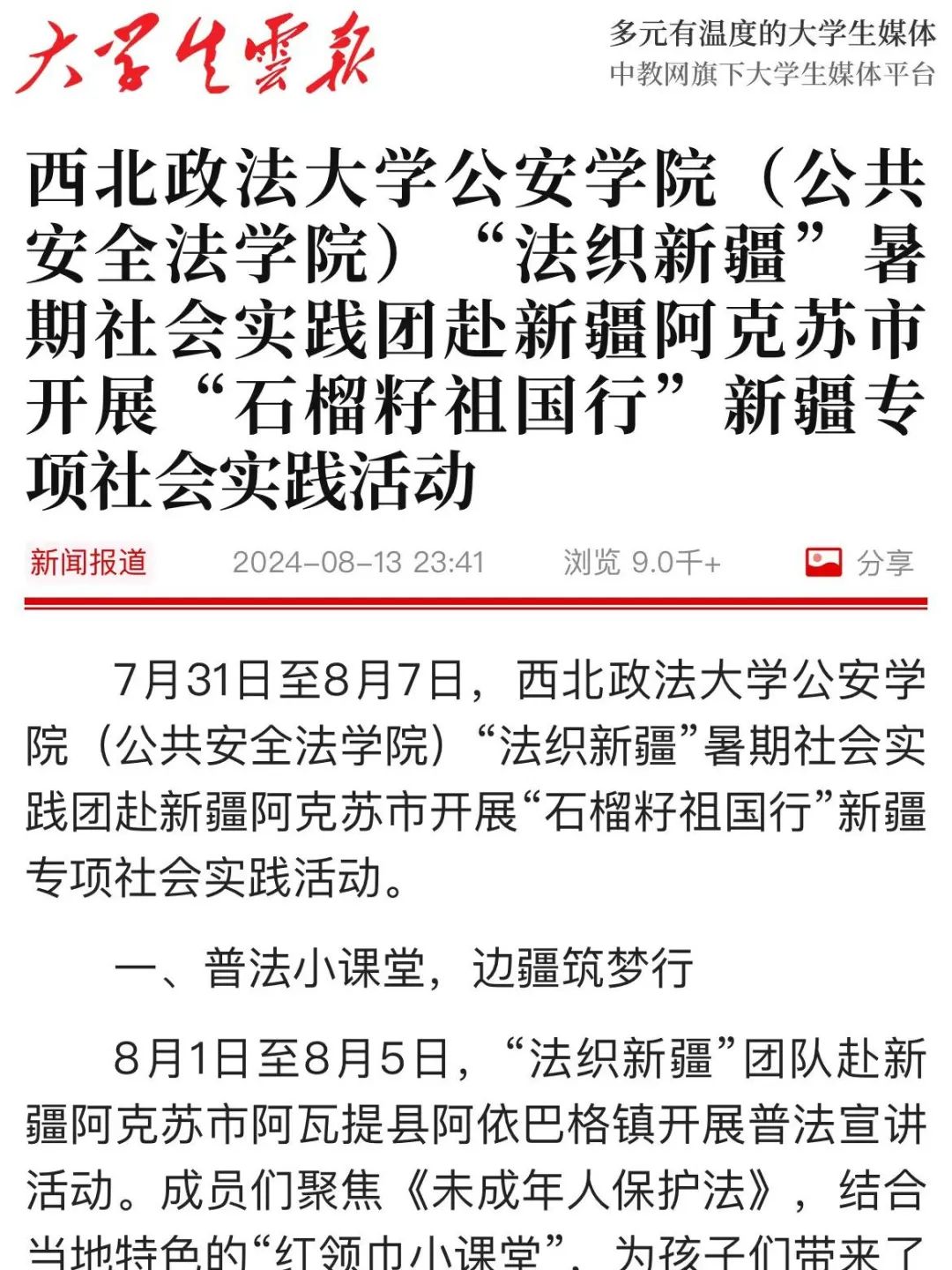 第一版主 “法织新疆”暑期社会实践团赴新疆阿克苏市开展“石榴籽祖国行”新疆专项社会实践活动。本次实践活动的显著成效赢得了当地政府和居民的普遍赞誉和高度评价,其实践成果被大学生云报、青春阿瓦提、阿瓦提县融.阿依巴格镇站等多家媒体报道,展现了西法大青年良好的精神风貌,为学校、学院赢得口碑和关注。