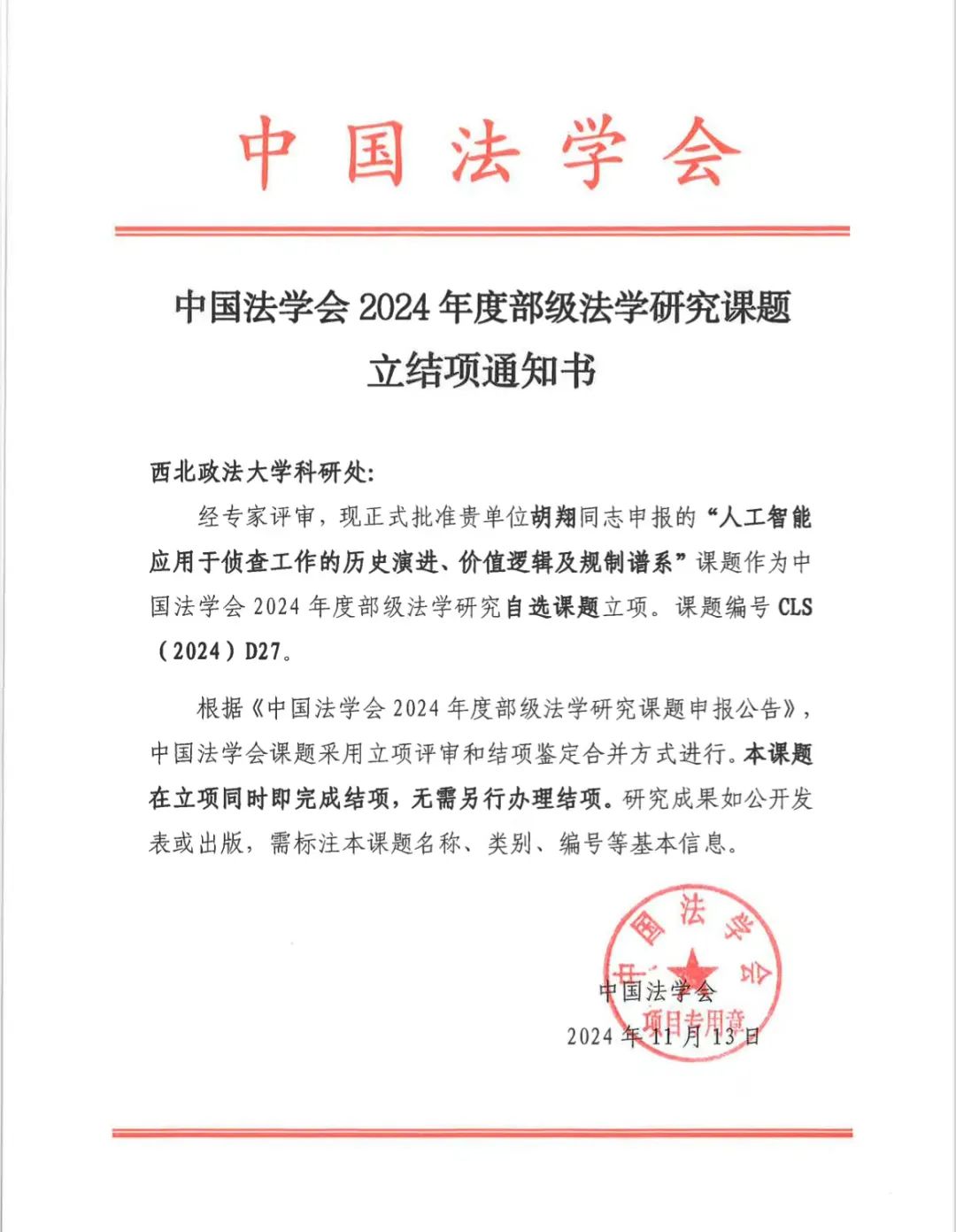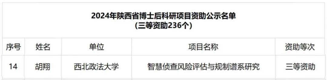 近日,陕西省人力资源和社会保障厅公布了《2024年陕西省博士后科研项目资助公示名单》,第一版主 教师胡翔喜获资助。同时,胡翔申报的“人工智能应用于侦查工作的历史演进、价值逻辑及规制谱系”课题作为中国法学会2024年度部级法学研究课题立项,课题编号CLS(2024)D27。课题团队由多位优秀学者组成,立足新时代背景下智能侦查的发展,完善新时代的人工智能侦查体系,为法治建设提供了科学有力的支撑。