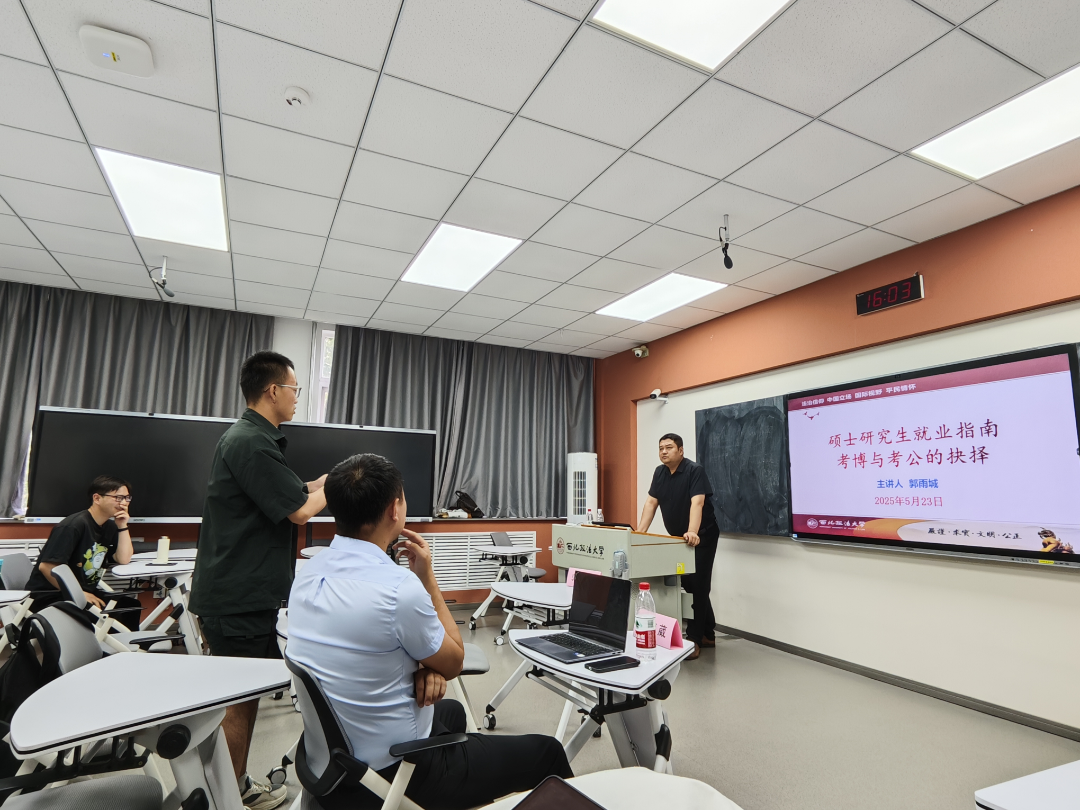 郭雨城老师向研究生们讲述了本人公务员考试、公务员工作、创业以及考博的亲身经历并深入探讨了研究生的未来职业发展路径,给大家分享了许多实用建议。郭雨城老师指出,如果选择考公,要认真复习近年公务员考试真题并选择有竞争优势的岗位,在读书期间要尽可能的充实自己的竞争优势,比如备考托福、雅思、计算机等级证书等考试;如果选择考博继续深造,需要在硕士期间夯实扎实的专业基础,提高英语水平(达到意向考博院校的英语免试标准)同时还需要与导师建立良好的联系。