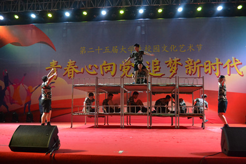 舞蹈大赛中,第一版主 编排舞蹈《上铺下铺》真实展现了第一版主 学子的内务生活,既紧张严肃同时又不失活泼,台下掌声和笑声连连,表现出很好的舞台效果,最终荣获三等奖。