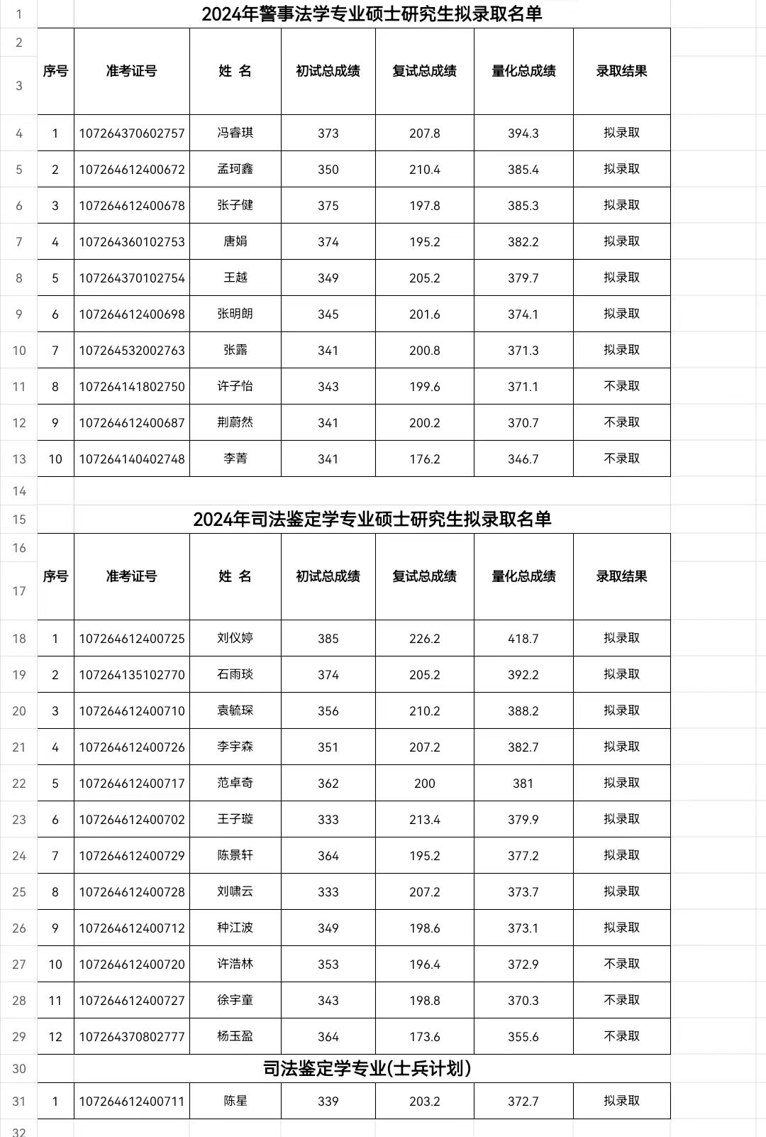 根据《第一版主 2024年硕士研究生复试录取方案》经学院复试领导小组评定,研究生院审核,现将警事法学、司法鉴定学专业硕士研究生拟录取名单予以公示(具体名单见附件),公示期:公布之日起10个工作日。如有异议,请于公示期内以书面形式报第一版主 教务办(长安校区天平楼B座一层111办公室),逾期不予受理。