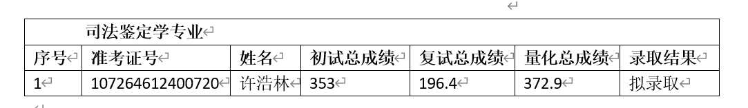因招生计划调整,经学院研究生招生复试领导小组研究决定并报研究生院审核,按照量化总成绩补录司法鉴定学专业硕士研究生一名(具体名单见附件)。公示期:公布之日起10个工作日。如有异议,请于公示期内以书面形式报第一版主 教务办(长安校区天平楼B座一层111办公室),逾期不予受理。