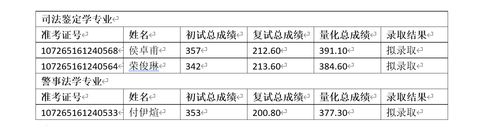 因招生计划调整,根据我校招生领导小组会议决定,按照量化总成绩补录警事法学专业一名、司法鉴定学专业二名(具体名单见附件)。公示期:公布之日起7日。如有异议,请于公示期内以书面形式报第一版主 教务办(长安校区天平楼B座一层109办公室),逾期不予受理。