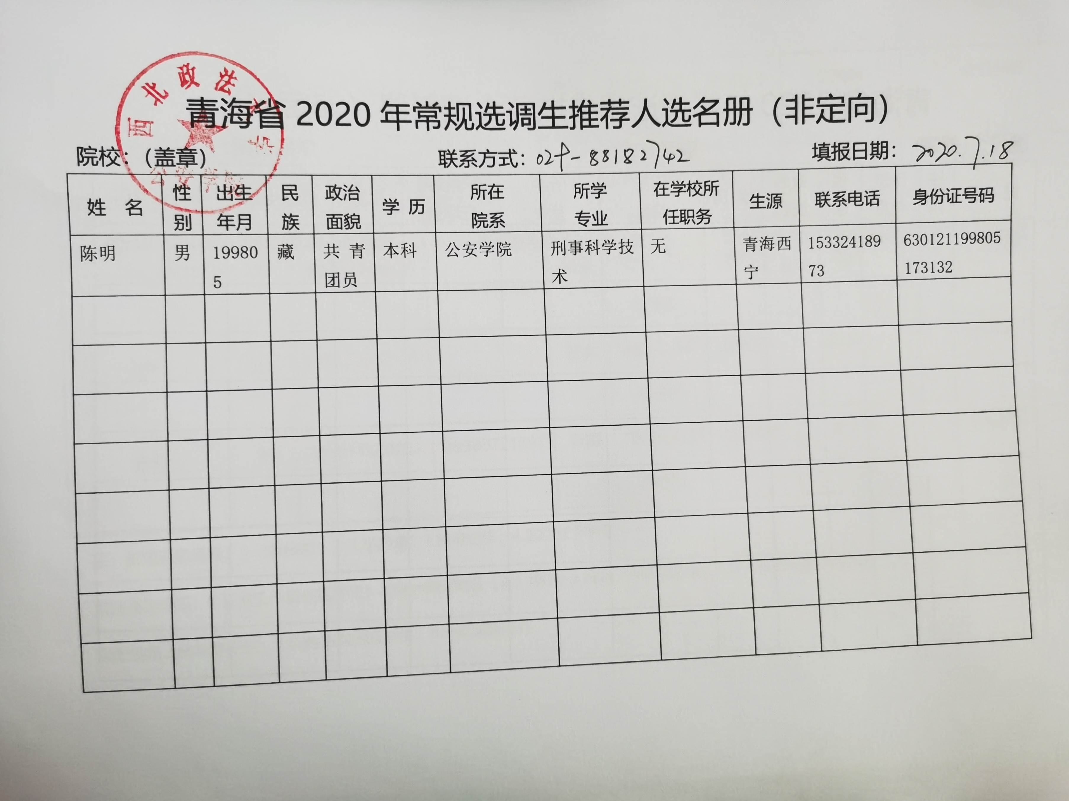 根据青海省委组织部《青海省2020年常规选调生选调公告》文件要求,经学生个人申请,院系推荐,学院及校就业中心审核,现将第一版主 2020年常规选调生拟推荐人选予以公示。