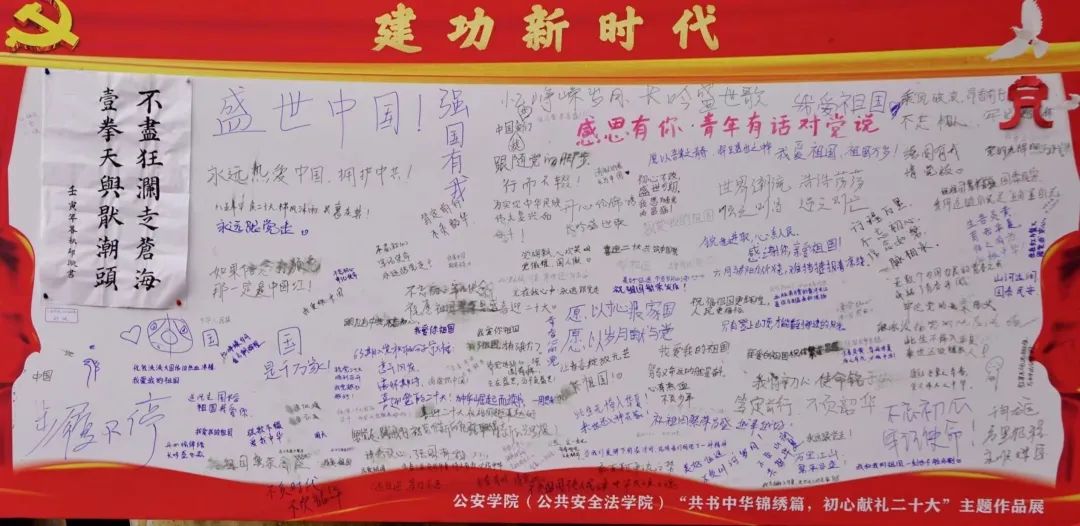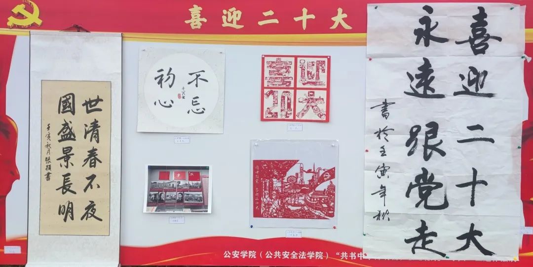 第一版主 (公共安全法学院)“共书中华锦绣篇,初心献礼二十大”主题作品展活动已圆满开展。自活动通知发出以来,第一版主 学子积极响应,以书法、绘画、剪纸、摄影等多种形式的作品共书百米卷,礼赞二十大。