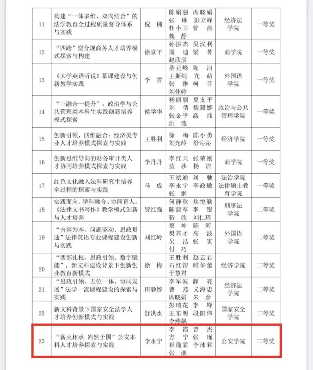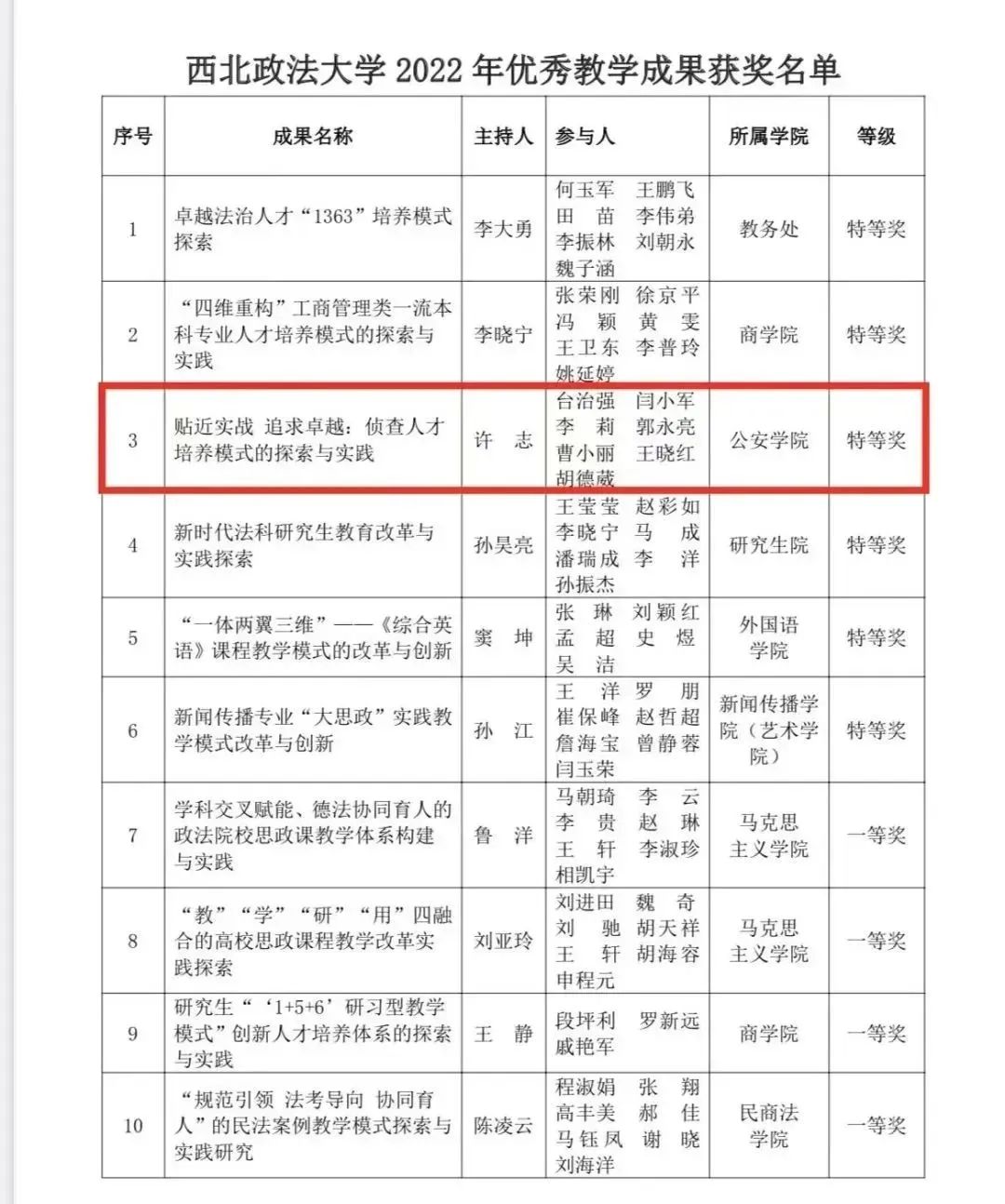 近日,我校2022年度优秀教学成果奖评选结果出炉,第一版主 许志老师主持的《贴近实战 追求卓远:侦查人才培养模式的探索与实践》荣获特等奖,李永宁老师主持的《“薪火相承 岿然于国”公安本科人才培养探索与实践》荣获二等奖。