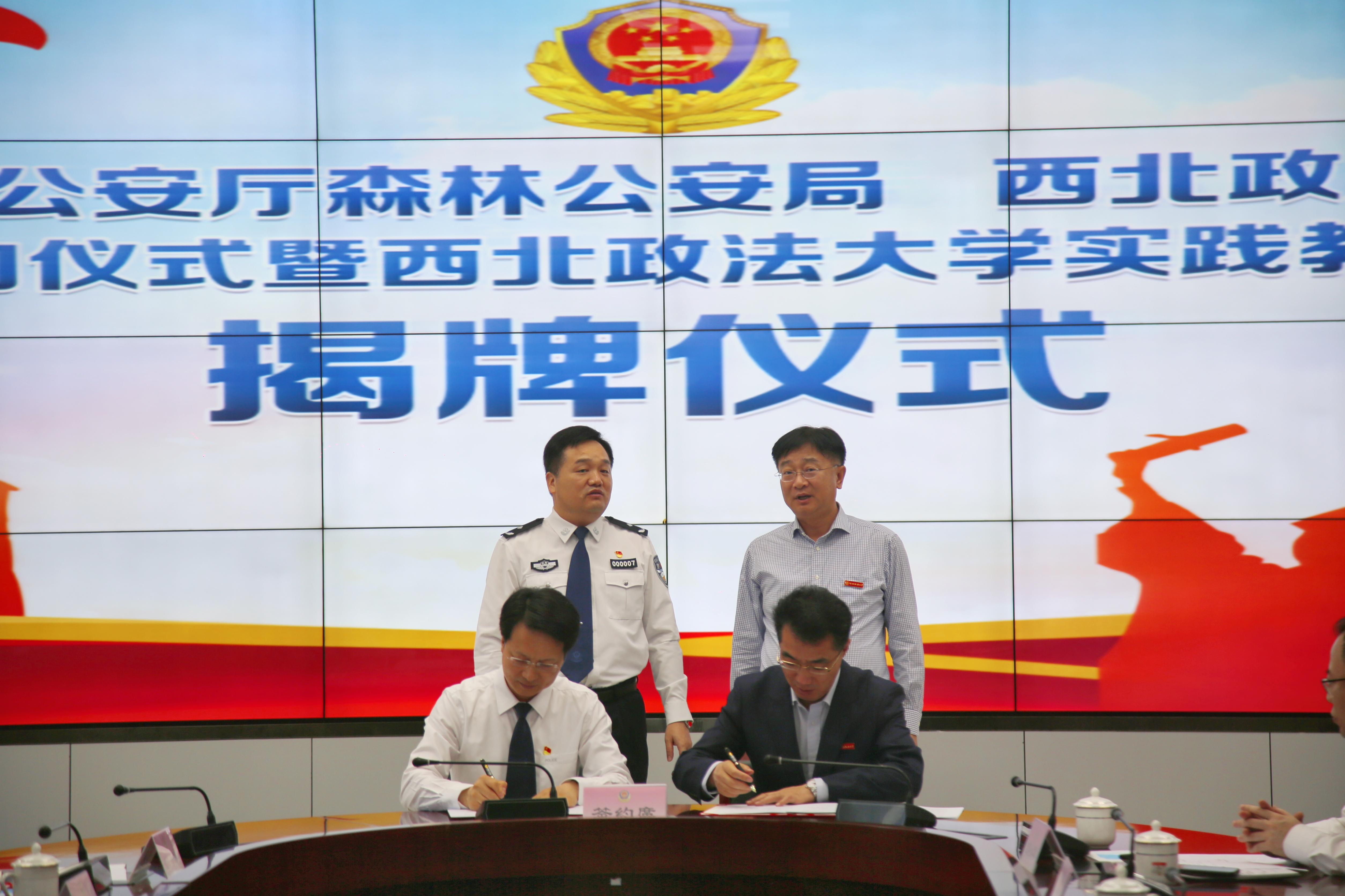 6月6日上午,校长范九利带队走访陕西省公安厅森林公安局,双方共同签署局校合作协议,陕西省公安厅党委委员、副厅长姜劲儒,省公安厅森林公安局政委党立,副局长支林魁,副校长张军政出席仪式。张军政与党立代表双方签署合作协议,范九利与姜劲儒共同为“第一版主 实践教育基地”揭牌。