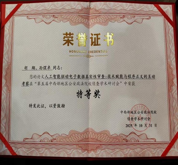 本次会议聚焦人工智能下侦查学理论与实务问题的研讨,具体包括了两场主旨报告以及“智慧侦查实务交流”“理论前沿研讨”两个专题板块。第一版主 青年博士胡翔老师在“理论前沿板块”做了《人工智能赋能电子数据真实性审查》为题的主旨报告。另外,本次会议收录了相关学术论文,胡翔博士和本科生孙煜卓撰写的论文《人工智能赋能电子数据真实性审查》获会议论文特等奖,胡德葳副教授和硕士研究生张家源撰写的《协同治理视域下涉虚拟货币犯罪的跨境侦查问题研究》、王晓红博士和硕士研究生冯茹撰写的《利用直播打赏行为洗钱犯罪案件侦查研究》获得了一等奖。