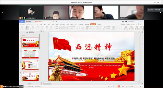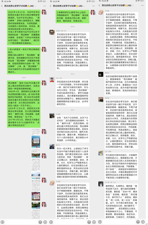 团委书记李凯对青年团员强调到:“身为一名西法大学子定要脚踏实地,潜心学习,奋勇向前,把自己的学业和事业与民族复兴结合起来,到国家需要的地方贡献自己的青春力量。西迁精神是永不磨灭的精神丰碑,是大家学习,进步,发展和西部建设的不竭动力。”各年级学生党支部、团支部在微信群中展现线下讨论,同学们纷纷发表自己对西迁精神的学习感悟。