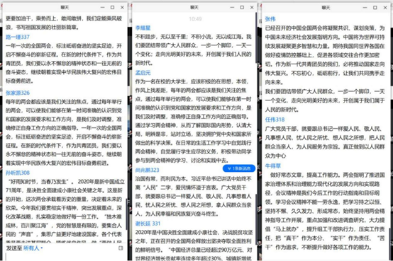 在各年级辅导员的组织带领下,各学生团支部的同学们通过群内讨论、视频观看、腾讯会议等多种线上方式对“两会”内容进行学习,并在班级群进行讨论交流。在学习中,同学们特别关注了今年“两会”提出的关于新冠疫情防控、经济社会发展目标、脱贫攻坚、全面建成小康社会、民法典草案、民生保障、外部环境应对等热点问题。同学们对热点问题展开讨论并沟通交流学习心得,大家纷纷表示作为青年大学生,要让两会精神走心、入脑、见行动,在学习、工作、生活中严格要求自己,修炼自身道德素质,坚定信念,敢于担当,练就过硬本领,为实现中华民族伟大复兴的中国梦汇聚青春力量。