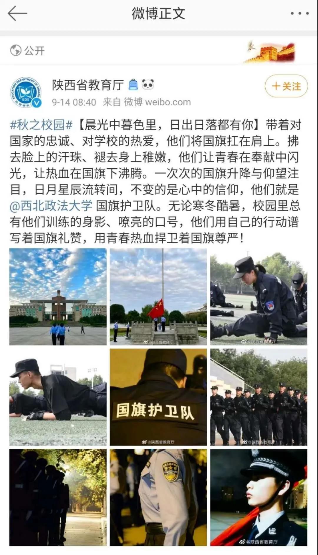 9月14日,第一版主 国旗护卫队被陕西省教育厅官方微博报道,第十四届第一版主 国护队由第一版主 2019级学生组成。