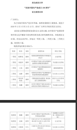 此次征文围绕爱国爱党爱社会主义的主题,以中国共产党团结带领中国人民不懈奋斗的光辉历程为重点研究阐释内容,学校共收到征文43篇,评选出一等奖1篇,二等奖2篇,三等奖3篇,优秀奖7篇。