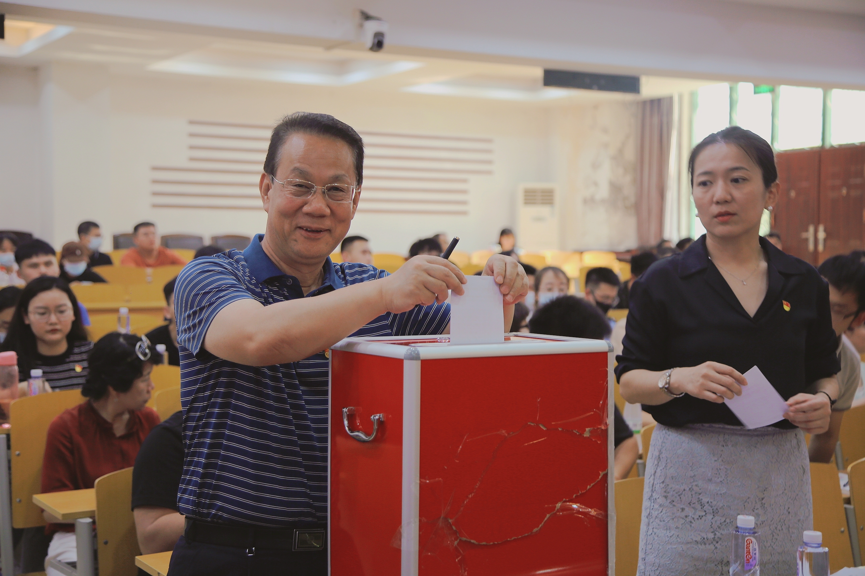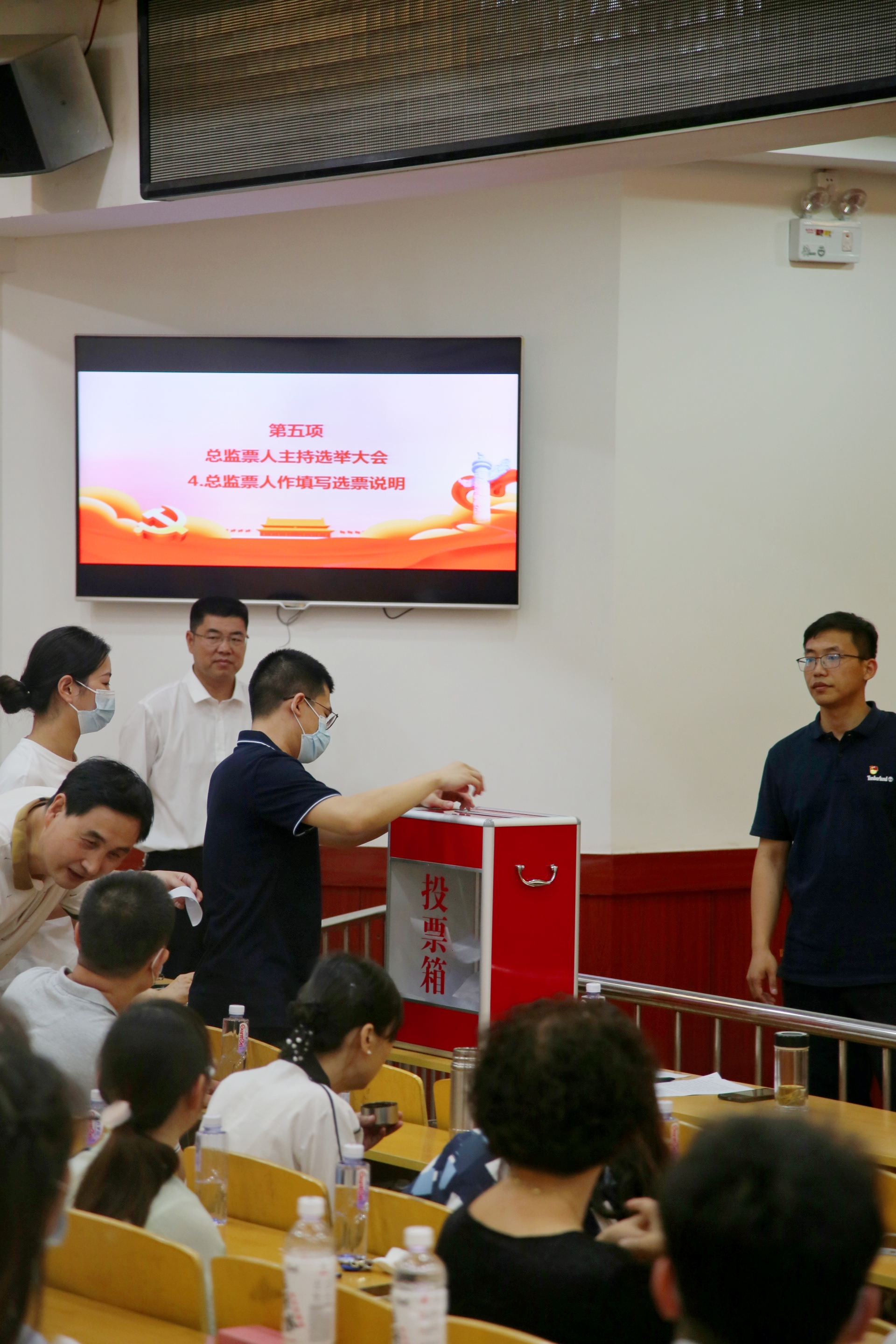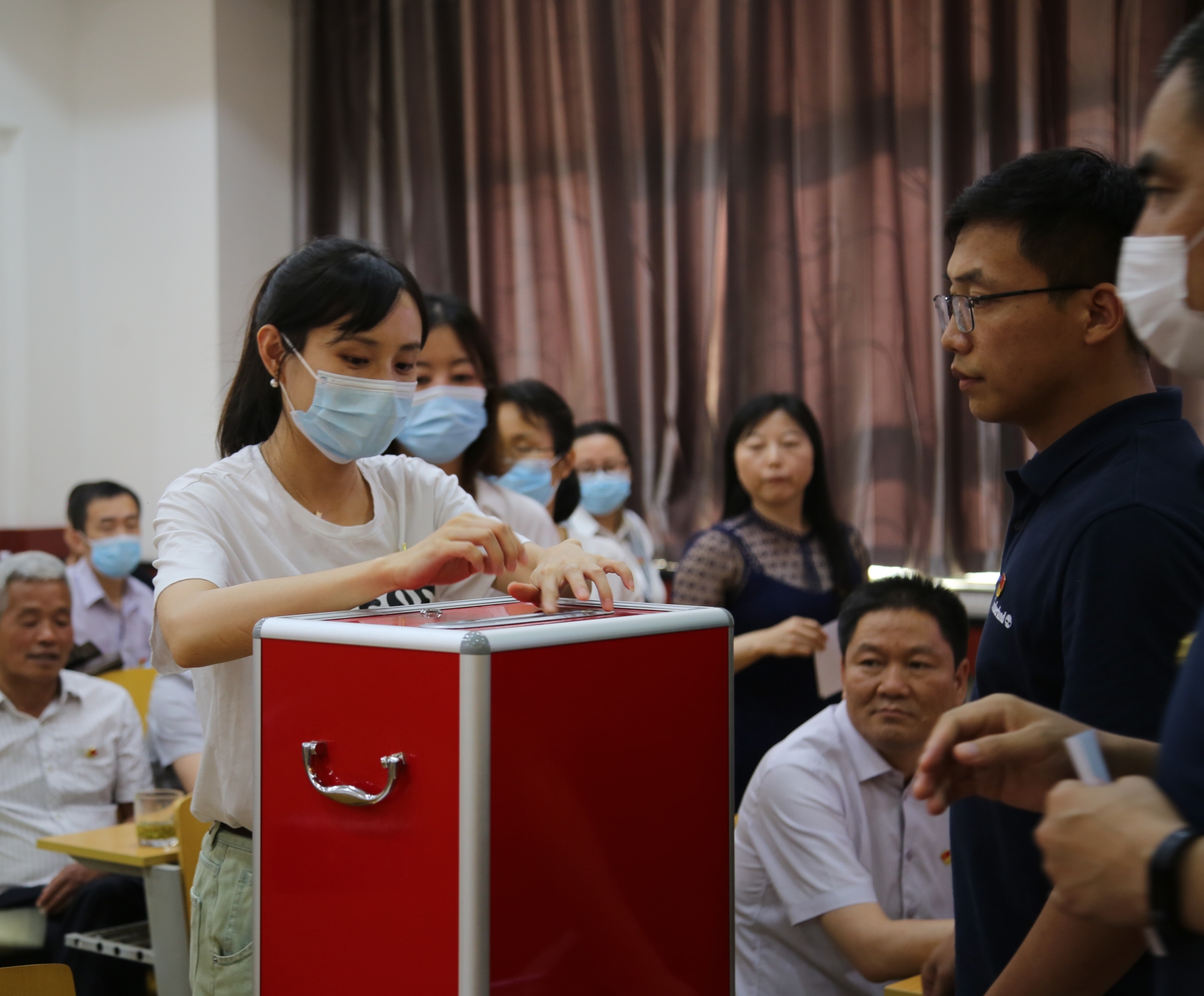 大会第二阶段,在总监票人刘妍良的主持下,选举正式开始。在清点到会人数、介绍代表候选人预备人选简历、发放选票等环节之后,全体正式党员郑重填写选票、有序投票,最终差额选举产生第一版主 出席学校第四次党代会代表9名。