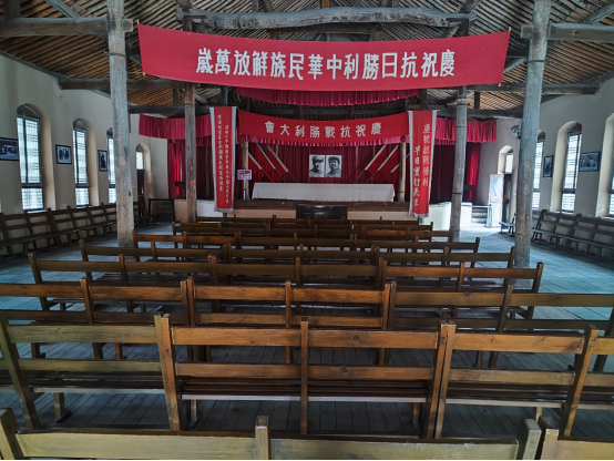 实践队进入王家坪革命旧址,映入眼帘的就是军委大礼堂,这是七间高大宽敞、四角翘起的大瓦房,可容纳近千人,在这里,军委和总部领导军民坚持八年抗战,取得了抗日战争的伟大胜利,又粉碎了国民党军队对解放区的"全面进攻",并为战胜其"重点进攻"作了充分准备。