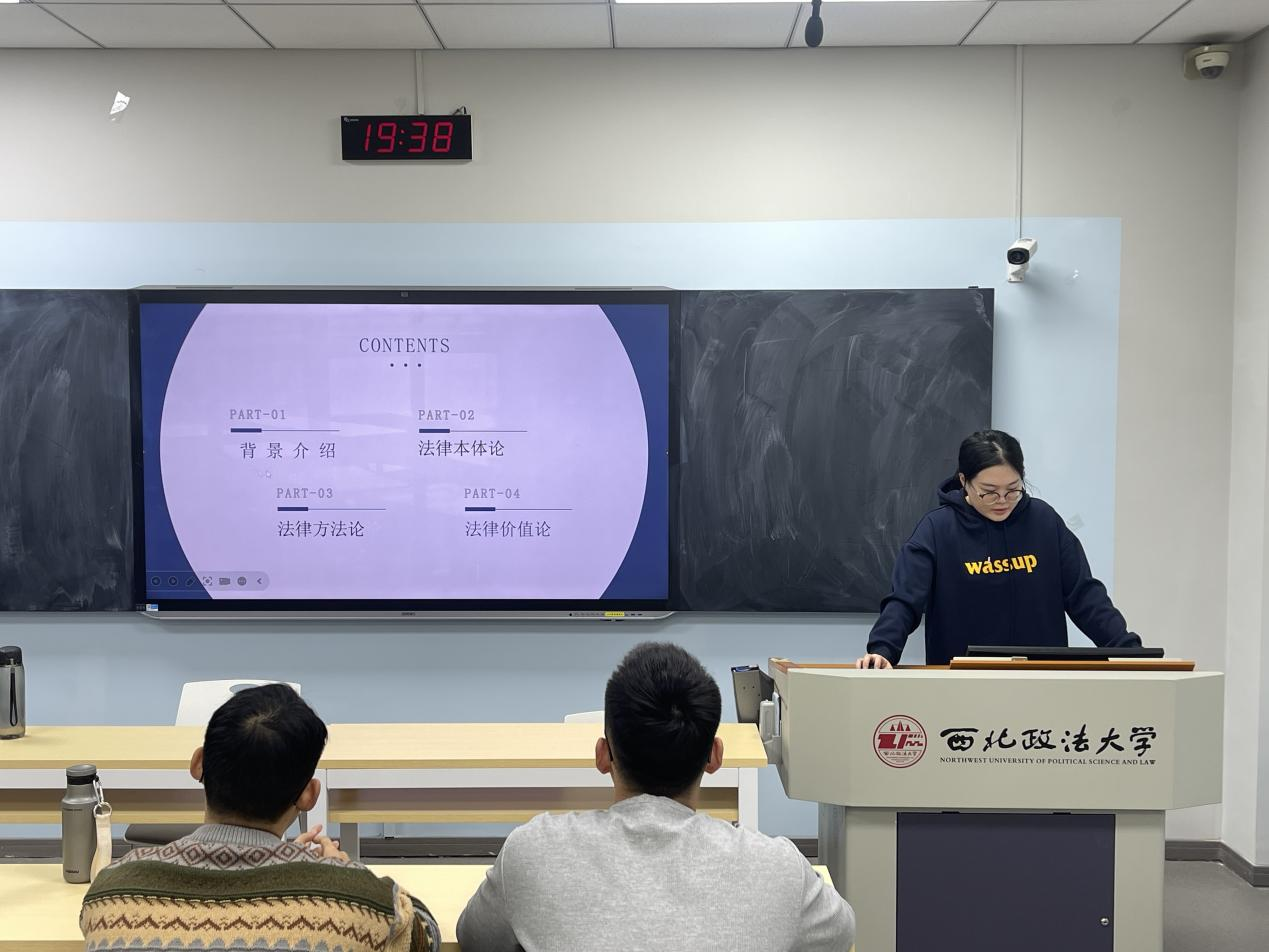 23级法律硕士杨荆楠同学从法律本体论、法律方法论、法律价值论三分方面对本书进行了梳理概括。杨同学首先介绍了本书的背景与内容概要。她认为法律是社会控制工具,包含秩序、依据和过程三个层次,通过调整关系和安排行为维护社会秩序。杨同学还提到了庞德强调法律的根本精神是正义,将正义与利益结合,提出最高效节约地满足人类需求作为法律任务。在法律价值论上,庞德指出法律背后总有评价冲突利益的准则,这些准则经立法者和法律工作者系统发展,与文明社会生活假说相关,适应当时法学任务和社会理想。