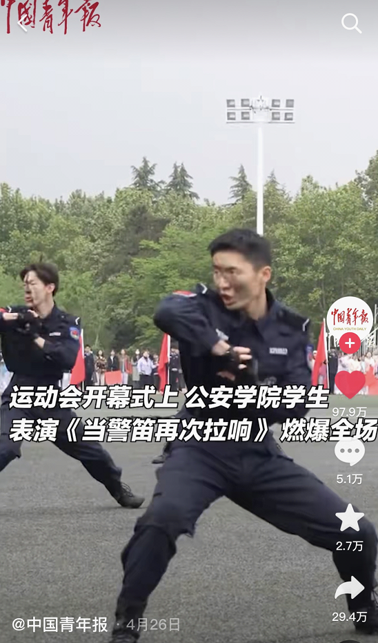 近日,我校第三届体育文化节暨第43届田径运动会隆重举行。国旗护卫队在运动会开幕式上表演的《当警笛再次拉响》青春洋溢、场面震撼,受到央视网、中国青年报、陕视新闻等多家主流媒体转载报道,展现出西法大青年蓬勃向上的精神面貌。国旗护卫队表演在抖音、微信等新媒体平台点赞量达百万余人次。